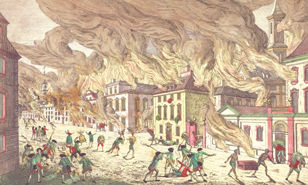 1776년 9월 20일 밤부터 뒷날 아침까지, 맨해튼의 Fighting Cocks Tavern에서 엄청난 화재가 발생했습니다. 이 화재로 도시의 약 4분의 1이 불에 타며 약 500채의 건물이 파괴되었고 파괴되지 않은 도시의 일부는 약탈되었습니다.