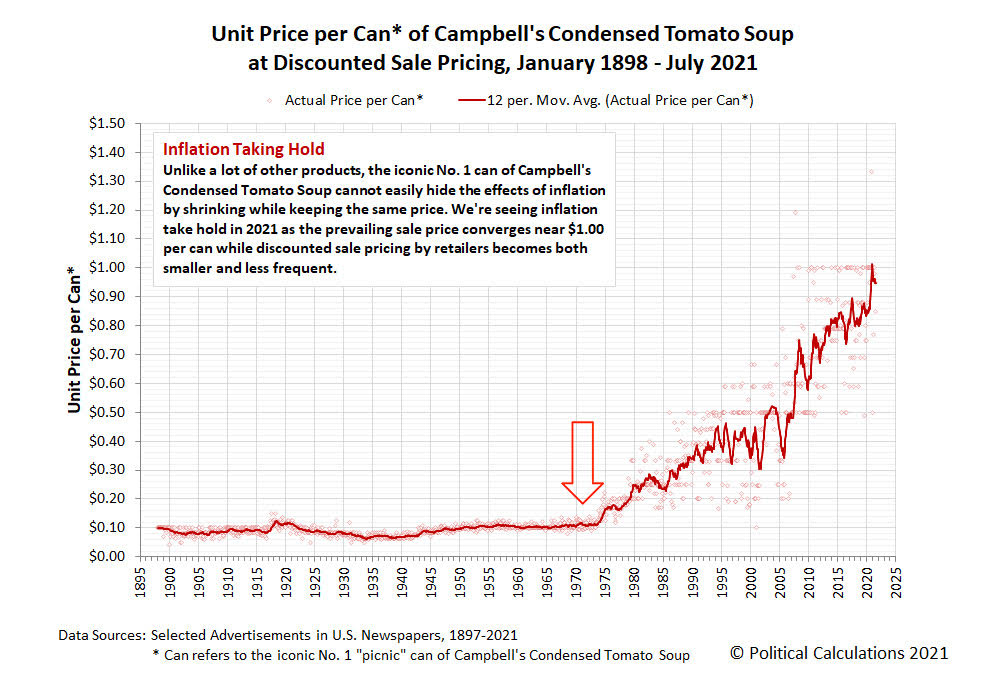 이 수프 브랜드(Cambells)가 쓰인 이유는 이 수프 브랜드는 크기를 줄이거나 해서 인플레를 숨기기 힘들기 때문입니다.