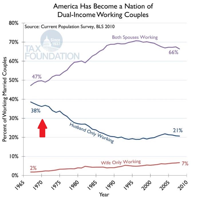 위 사진을 보면, 1971년 달러가 그 자체로서 기축통화가 되어 버린 후로 집안에 부부가 모두가 일하는 현상이 급증하는 게 보입니다. 뿐만 아니라