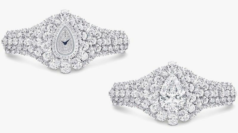 이 시계에는 152.96캐럿의 화이트 다이아몬드를 담고 있고 시계 중앙에는 커다란 배 모양의 희귀한 다이아몬드가 있습니다.