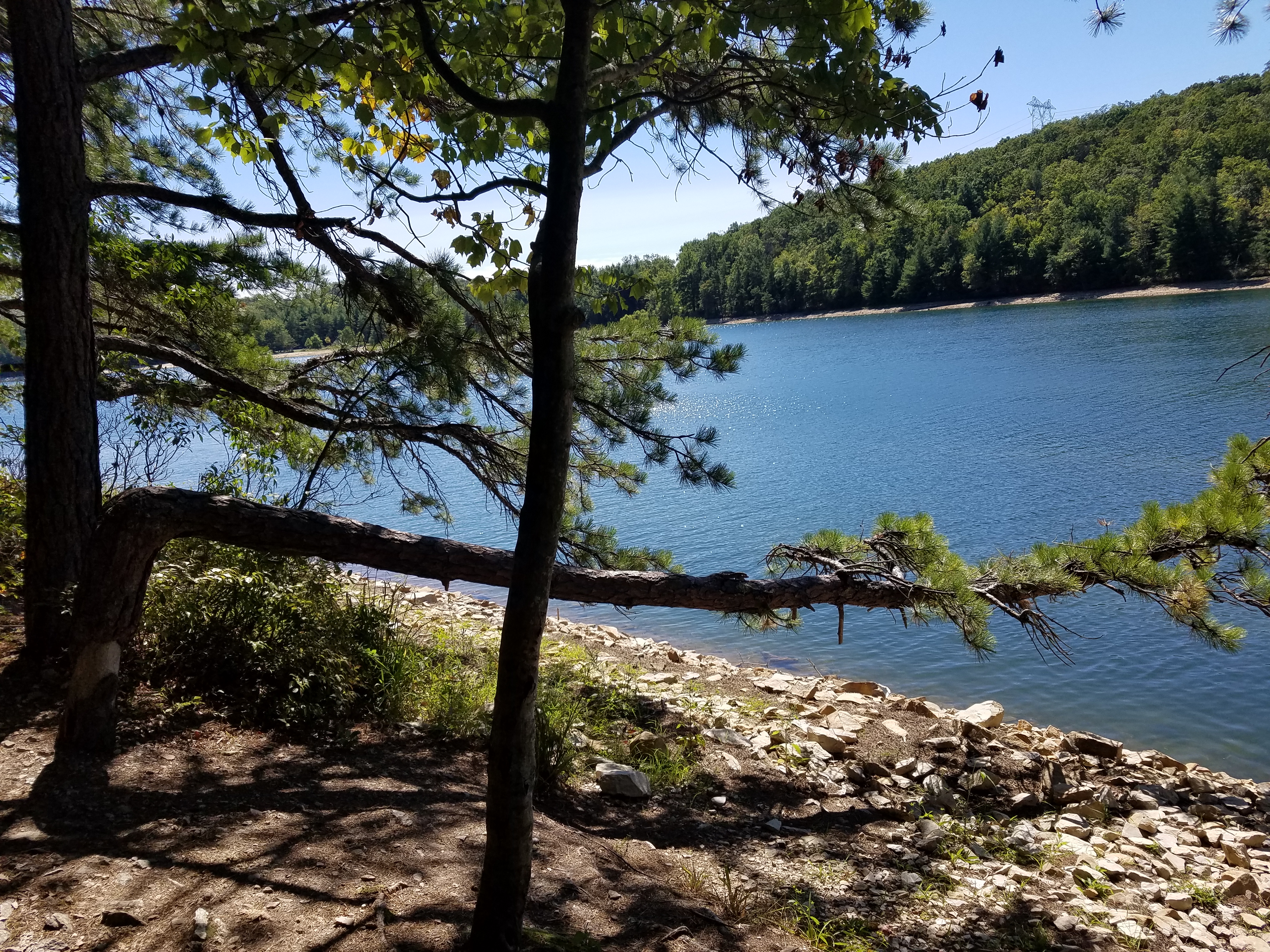 땜 뚝이 나뭇가지 사이로 보인다 저 땜을 걸어서 지나면 호수 속 섬으로 가지만 나는 좀 더 걷기를 택해서 땜 아래로 내려와 걸었다