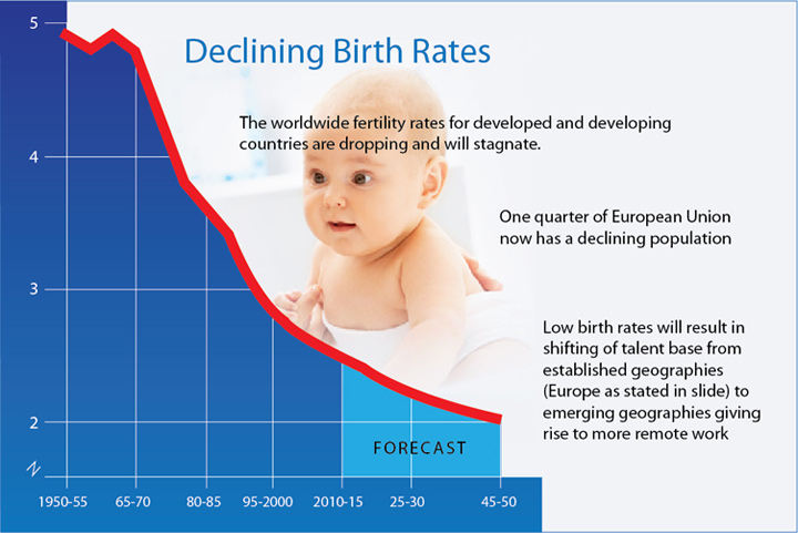 인구 감소의 또 다른 원인은 낮은 출산률입니다. 미국 뿐 아니라 세계 여성들은 평균출산률 보다 낮은 출산 비률를 그립니다.